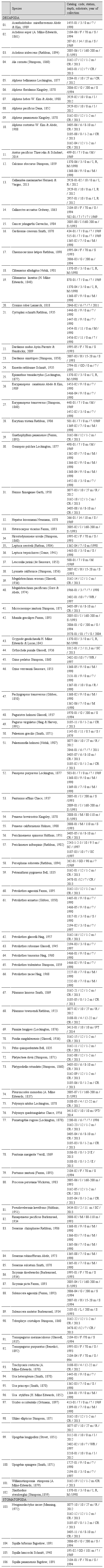In total, there were 19 stations for which information was available (Fig. 1). Intertidal and SCUBA diving stations were assigned a code number, while those from trawl nets were identified with capital letters. A total of 106 species of macrocrustaceans with 173 entries was available for Golfo Dulce and catalogued in the collection of the Museum of Zoology (Appendix 1). Of this total, 102 are decapods and four are stomatopods. The earliest collection records are from 1969, followed by a time gap, until 1990 and 1993-1995 when 83 (48%) new entries were listed, many as the result of the R.V. Victor Hensen survey. The next intensive sampling effort took place during 2012-2013. Thirty-nine of the collecting sites were coral rocks, while 32 stations were from sediments. Most of the collecting sites were intertidal. The maximum depth sampled was 200m (Appendix 1).
