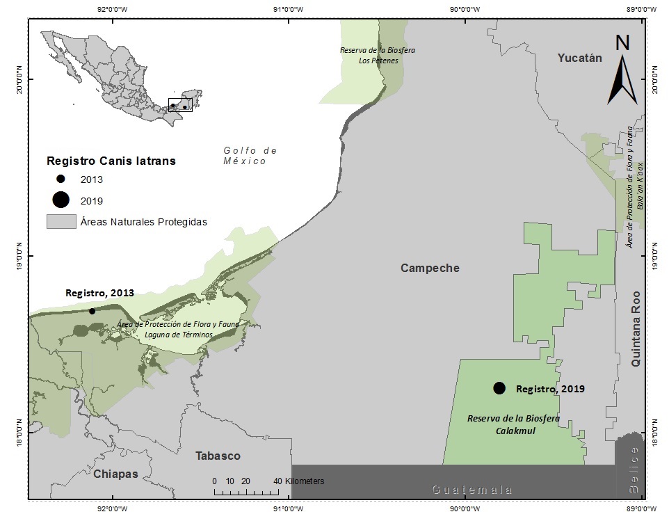 Abstract: “A record of the coyote (Carnivora: Canidae) in the Calakmul Biosphere Reserve, Mexico”. In recent years the coyote (Canis latrans) has expanded its range in the tropical areas of Mexico and Central America. We report the first record of a coyote in the Calakmul Biosphere Reserve in the southeastern, Mexico. Using photo trapping, from December 2018 to June 2019, tree photographs of coyotes were obtained from a site located in the center of the southern core area of the reserve.
