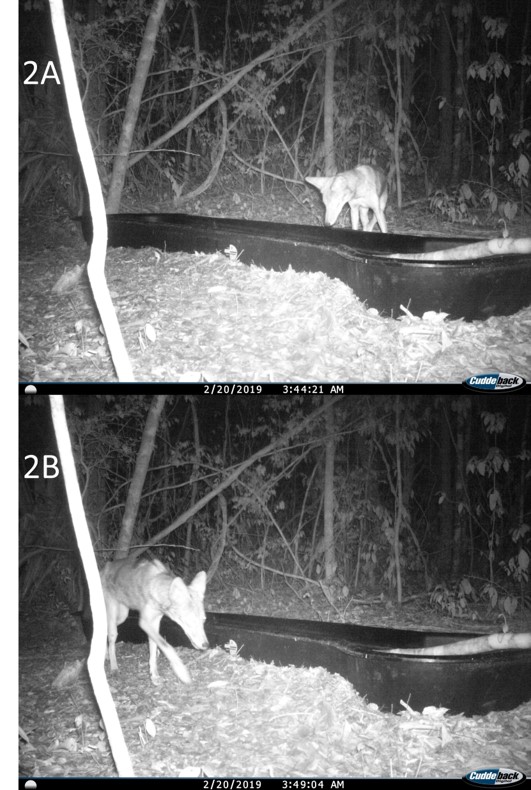 Inicialmente se pretendía evaluar el funcionamiento de los bebederos como fuente de agua funcional para fauna silvestre, para lo cual, se colocó a cada bebedero un cámara trampa, con el fin de detectar aquellas especies que ocurrieran en el sitio para tomar agua. Se colocaron 10 cámaras trampa marca Cuddeback (Non Typical Inc., De Pere, WI, USA), entre el 6 de diciembre del 2018 y el 20 de junio del 2019. La cámara se encontraba asociada a un bebedero artificial donde se abastecía agua para la fauna silvestre. El área donde se obtuvieron los registros es una zona con poca pendiente, con altitudes máximas de 250msnm, la vegetación principal alrededor de la estación de fototrampeo es predominante de selvas medianas subcaducifolias secas, comunidades primarias y secundarias con árboles de entre 5 y 15m de altura en promedio (Martínez & Galindo-Leal, 2002). Después de un esfuerzo de muestreo de 1 620 noches/cámara trampa (una noche/cámara trampa equivale a una cámara trampa activa por 24 horas) se obtuvieron tres fotografías de coyotes en una de las estaciones, la cual se encontraba en una matriz de selva mediana subcaducifolia (18.247578N & 89.804495W). Las fotografías corresponden a un individuo adulto y de sexo indefinido. Las circunstancias en las que se observa al individuo en la fotografía sugieren que este se encontraba tomando agua en el bebedero artificial (Fig. 2A y 2B).