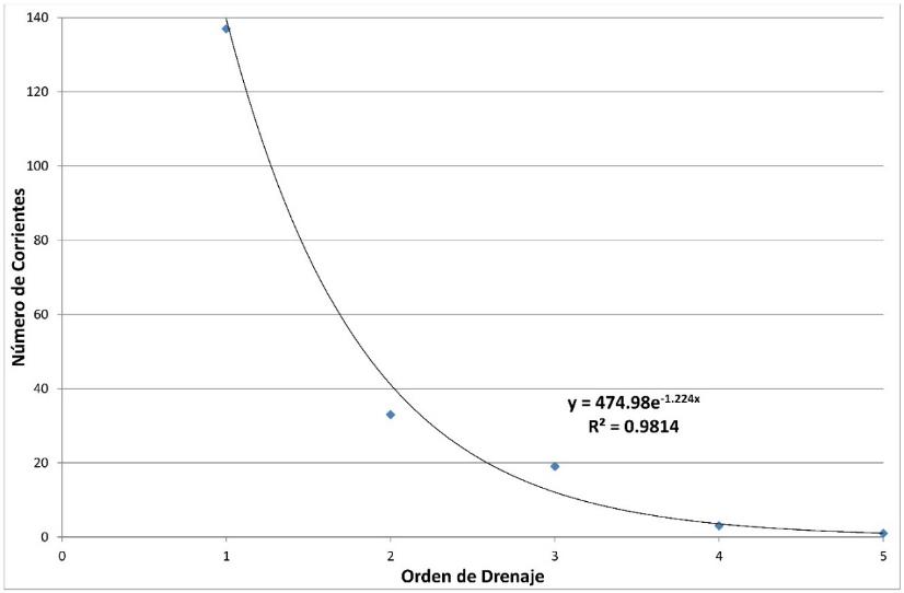 El incremento en el número de orden, de 1 a 5 (Cuadro 1), se relacionada directamente con el tamaño de la cuenca (Kumar & Joshi, 2015) como también con la continua erosión de las orillas de los ríos, esto último observable en distintos sectores de la cuenca. La relación del número del número de corrientes con respecto a su orden permite establecer una ecuación a partir de una función exponencial, esta función puede ser utilizada para comparar cuencas semejantes (Kabite & Gessesse, 2018). La cuenca presenta un patrón dendrítico el cual es un indicador de la homogeneidad del estrato subsuperficial (Singh, et al., 2014) en este caso materiales volcánicos como cenizas, tobas y lavas.
