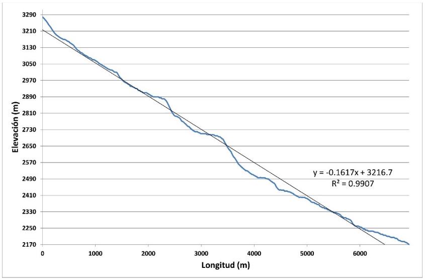 donde H = es la altitud (m) y L = la longitud de la trayectoria del drenaje (m). En este caso, la pendiente del cauce principal fue estimada en 0,1617.