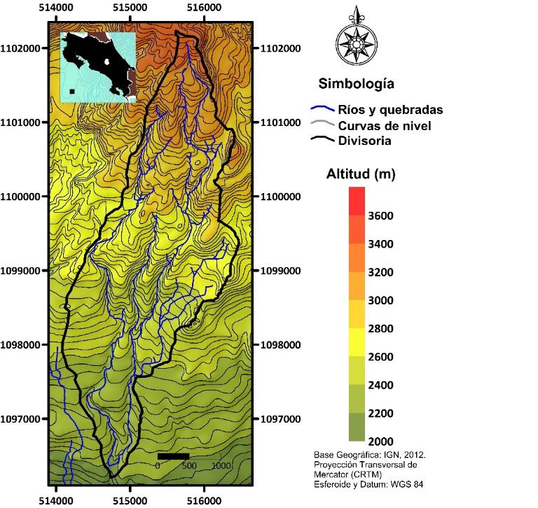 Área de estudio: Comprende la parte alta de la cuenca del Río Páez, entre las coordenadas 514 000m y 516 000m este y 1 096 000m y 1 103 000m norte del sistema de proyección Transversal de Mercator para Costa Rica (CRTM). Presenta un área superficial de 6,79km2. Hacia ambos lados de la cuenca, nacen los ríos Reventado y Birrís, los cuales corresponden con sus cuencas vecinas y las cuáles comparten varias similitudes biofísicas. La cuenca alta presenta drenajes de cuarto orden.
