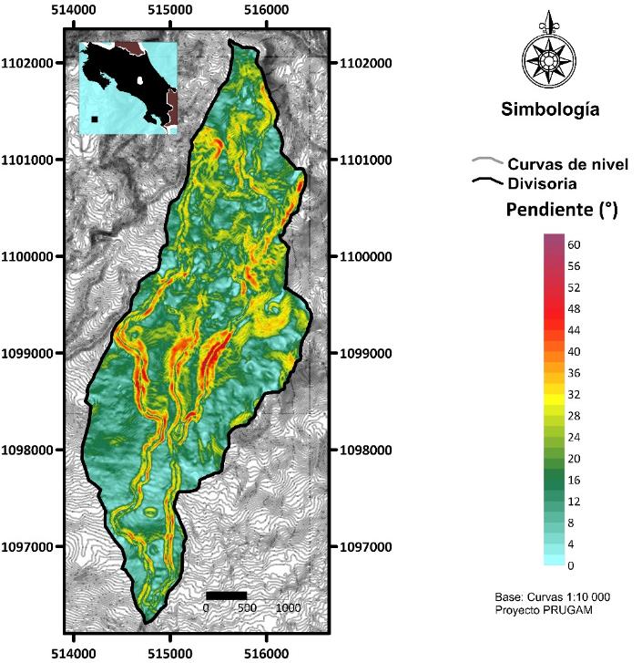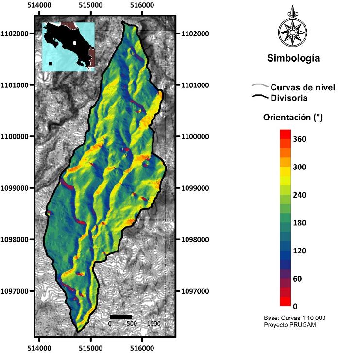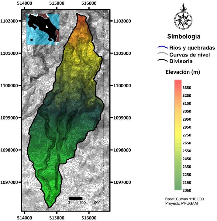 Características morfométricas: La morfometría de la cuenca alta del río Páez, fue obtenida con base en las curvas de nivel digitalizadas, cada 5m, del Gran Área Metropolitana (GAM), escala 1:10 000 del proyecto PRUGAM. Con estas curvas se construyó el Modelo de Elevación Digital (MED) en Surfer, versión 16, usando como método de interpolación la triangulación con interpolación lineal. Del MED se obtuvo el mapa de pendientes en grados y el mapa de orientación del terreno.