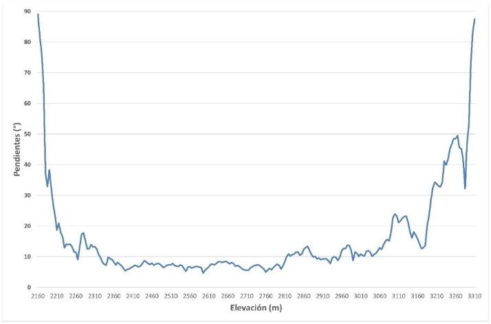 Al considerar las pendientes con respecto a los contornos de elevación, se puede visualizar con mayor detenimiento que las pendientes aumentan en la cuenca baja y en la cuenca alta, con variaciones significativas de la tendencia, la cual en general está debajo de los 10° entre los 2 360 y los 2 800m (Fig. 4).