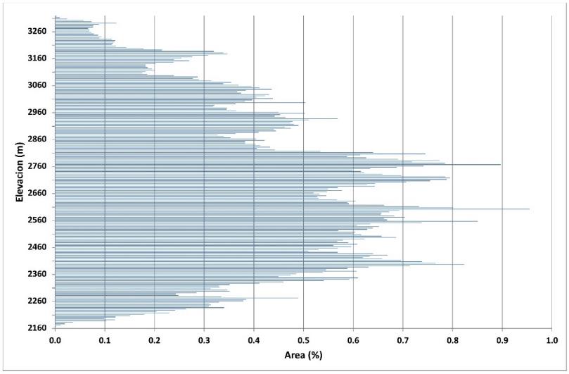 La curva de frecuencia de altitudes (Fig. 7) mostró como la mayoría del área de la cuenca alta se concentra entre los contornos altimétricos entre los 2 360m y los 3 060m.