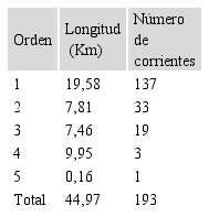 La relación de bifurcación entre los órdenes fue la siguiente: 4,15 para los órdenes 1 y 2, 1,74 para los órdenes 2 y 3, 6,33 para los órdenes 3 y 4; y 3,00 para los órdenes 4 y 5.