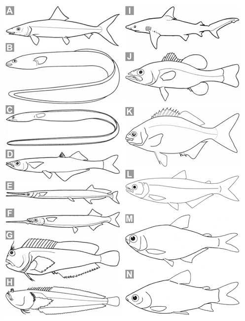 30a. Cuerpo generalmente alargado, su altura máxima generalmente representa menos de un 30% de la longitud estándar del cuerpo (medida desde la punta del hocico hasta el origen de la aleta caudal, sin contar esta), excepto en algunas especies de Clupeidae; aleta dorsal relativamente corta, la longitud de su base representa mucho menos de la mitad de la longitud estándar del cuerpo (medida desde la punta del hocico hasta el origen de la aleta caudal, sin contar esta), y generalmente restringida a la mitad posterior del cuerpo (su origen se sitúa por detrás de la línea media del cuerpo en el eje vertical), excepto en algunas especies de Albulidae (Fig. 1A), Clupeidae (Fig. 2C) y Engraulidae (Fig. 2E) … 31