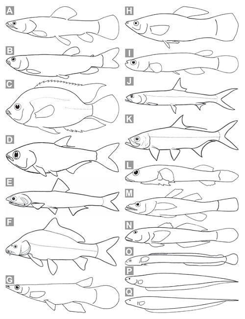 1a. Cuerpo anguiliforme (i.e., con forma de anguila o serpiente; Figs. 1B- C, 2P- Q, 4H), bastante alargado (la longitud total del cuerpo es mucho mayor que su altura máxima; ver Figs. 5A, 5C); escamas ausentes o muy reducidas; aletas pélvicas ausentes; aletas dorsal, anal y/o caudal ausentes, si presentes generalmente reducidas o fusionadas [excepto la anal en Gymnotidae (Fig. 2P) e Hypopomidae (Fig. 2Q) la cual es bastante conspicua]… 2