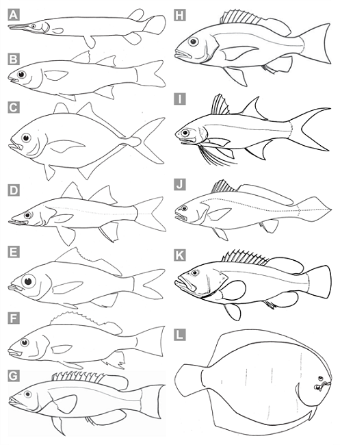 45b. Mandíbula inferior generalmente no proyectada anteriormente [ligeramente proyectada anteriormente en algunos miembros de Cichlidae (Fig. 8J) y Serranidae (Fig. 3K)]; extremo posterior de la boca generalmente no sobrepasando el límite posterior del ojo en el plano vertical [excepto en Serranidae (Fig. 3K), una familia asociada a ambientes costero-estuarinos]; región opercular (ver Fig. 5D) con (e.g., Fig. 3K) o sin (e..g., Fig. 5D) espinas rígidas; aleta dorsal sin una comisura fuerte separando las porciones espinosa y radiada [excepto en algunas especies de Gerreidae (Fig. 3E) y Haemulidae (Fig. 3F)] … 46