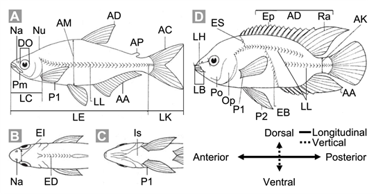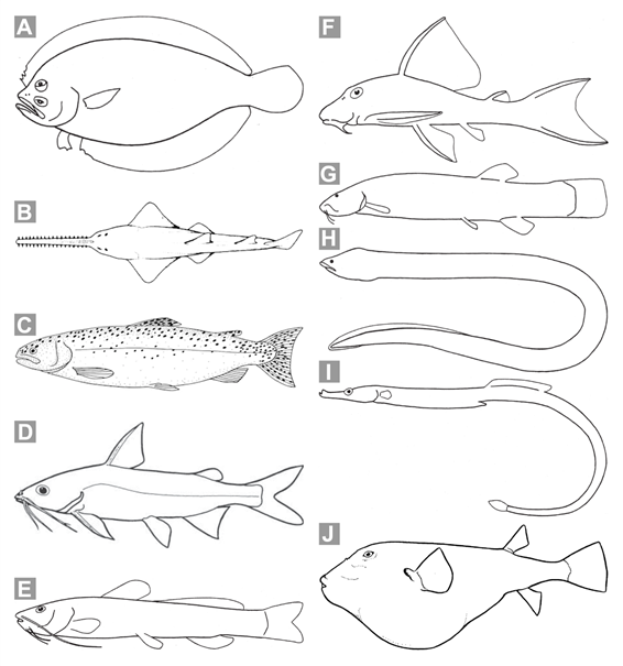 1b. Cuerpo de forma variable, muy alargado [e.g., Microdesmidae (Fig. 2O) y Syngnathidae (Fig. 4I)], ligeramente alargado (e.g., Figs. 1D-F), u oval o redondeado (la longitud total del cuerpo no es mucho mayor que su altura máxima; ver Figs. 5A, 5C), nunca anguliforme (i.e., no con forma de anguila o serpiente); escamas generalmente presentes, ausentes en algunos casos [e.g., Ariidae (Fig. 4D), Heptapteridae (Fig. 4E) y Trichomycteridae (Fig. 4G)] o modificadas como placas o anillos en otros [e.g., en Loricariidae (Figs. 4F, 6F) y Syngnathidae (Figs. 4I, 6E)]; aletas pélvicas generalmente presentes [ausentes en Syngnathidae (Fig. 4I) y Tetraodontidae (Fig. 4J)]; aletas dorsal, anal y caudal presentes [ver Figs. 5 y 7; aleta anal ausente en Syngnathidae (Fig. 4I)] … 6