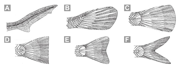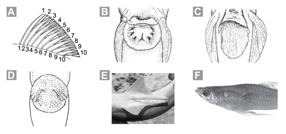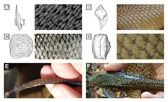 6b. Escamas presentes o ausentes, si presentes, del tipo ganoideas (Fig. 6B), cicloideas (Fig. 6C) o ctenoideas (Fig. 6D), nunca placoideas, en algunos casos modificadas como placas o anillos [e.g., en Loricariidae (Figs. 4F, 6F) y Syngnathidae (Figs. 4I, 6E)]; una única abertura branquial situada en el extremo posterior de la cabeza; aletas pélvicas en machos no modificadas como órganos copulatorios; aleta caudal heterocerca abreviada (en Lepisosteidae; Fig. 7B) u homocerca (en el resto de familias), variando en su estructura y forma (Figs. 7C-F) … 8
