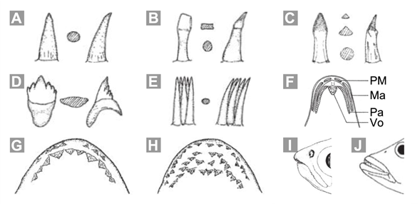 16a. Mandíbula superior generalmente no proyectada anteriormente (no sobrepasa claramente la mandíbula inferior en el plano vertical); mandíbula superior con 1 o 2 filas de dientes multicúspides (Figs. 8D-G), en las especies de Roeboides es posible observar además dos pares de dientes externos en el premaxilar; adultos no sobrepasando los 15 cm de longitud total … Characidae (representada en las aguas continentales e insulares de Costa Rica por 18 especies, conocidas como “Sardinas, Sardinas de río, Plateadas o Sabaletes”, distribuidas en todo el país; Fig. 1M)