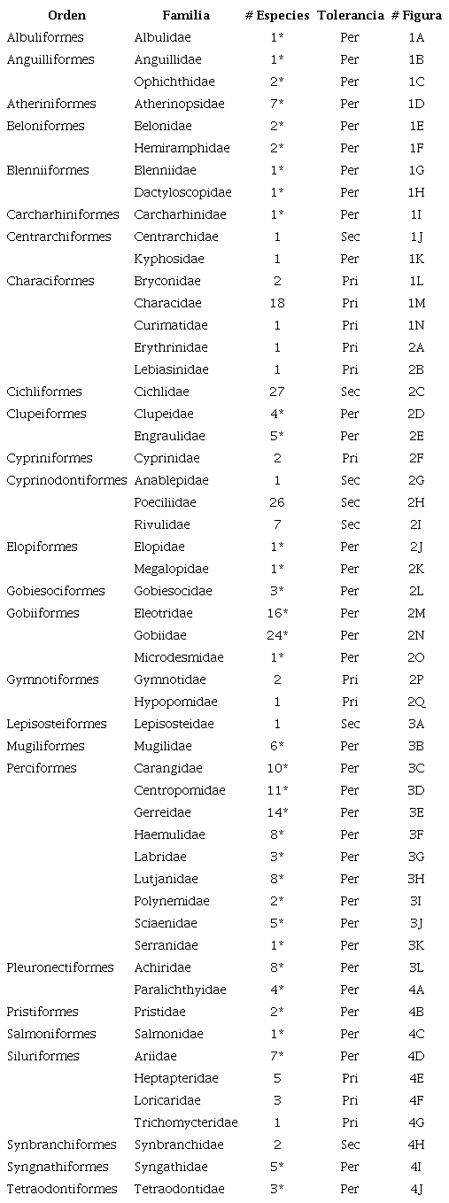 En esta revisión se incluyeron un total de 53 familias en 26 órdenes agrupando 274 especies (Cuadro 1). El número total de especies reportado incluye registros publicados en revisiones previas (e.g., Angulo et al., 2015; 2017; 2018; 2020, & Álvarez-Calderón et al., 2018) así como datos sin publicar. Del total de familias listadas 11 son, según la propuesta de Myers (1949), dulceacuícolas primarias (i.e., dulceacuícolas estrictas), 7 son dulceacuícolas secundarias (i.e., usualmente restrictas a ambientes dulceacuícolas, pero con tolerancia a condiciones variables de salinidad) y 35 son periféricas (i.e., típicamente marinas o asociadas a ambientes costero-estuarinos con capacidad de incursionar en ambientes dulceacuícolas) (Cuadro 1). La clave resultante se presenta a continuación: