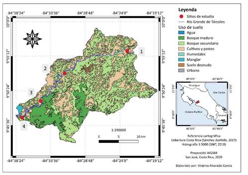 Se trabajó en la parte baja de la cuenca, en el cauce principal del Tárcoles, el cual comprende una superficie de 488km2, cubierta por bosque secundario, cultivos y pastos, bosque maduro, suelo desnudo, urbano, manglares, agua y humedales (Sánchez, 2017). Se identificaron cuatro sitios de estudio (Fig. 1). El primero se ubicó dentro del Proyecto Hidroeléctrico Chucás, en Atenas, específicamente dentro del embalse (9°55'55.60"N, 84°22'58.86"O); el segundo se ubicó en el Puente de Hamacas que divide los cantones de Turrubares y Orotina (9°52'48.18"N, 84°31'40.04"O); el tercero fue en el Tajo La Garita, ubicado cerca del Parque Nacional Carara (9°48'59.62"N, 84°34'59.43"O); y el último a 3km de la desembocadura del Tárcoles, en el pueblo de Tárcoles (9°46'39.42"N, 84°37'32.68"O).