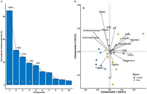 En el primer componente, los coliformes fecales y totales, el sodio, el magnesio, el calcio, el cloruro (iones mayoritarios del agua) y la temperatura presentan las mayores contribuciones en varianza; mientras que, en el segundo componente principal, las variables que mayor varianza aportan corresponden al nitrato, los sólidos totales, la DBO y el pH (fig. 2b).