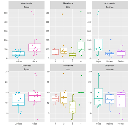 Es importante aclarar que la abundancia de organismos, que no utilicen ninguno de estos tres tipos de sustratos artificiales (madera, piedra, hojas) podría verse subrepresentada. Por lo que, recomendamos en futuros estudios, el uso de dragas bentónicas para complementar la diversidad de macroinvertebrados acuáticos en los sustratos suaves de sedimentos finos del fondo del río.