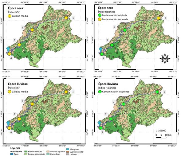 Índices de Calidad de Agua (NSF y Holandés): el índice Holandés evidencia que el río presenta contaminación incipiente, excepto el sitio 1, donde es moderada en época seca; mientras que, el ICA-NSF lo clasifica como un río de calidad media en todos los sitios y en ambas épocas (Fig. 4., Apéndice digital).
