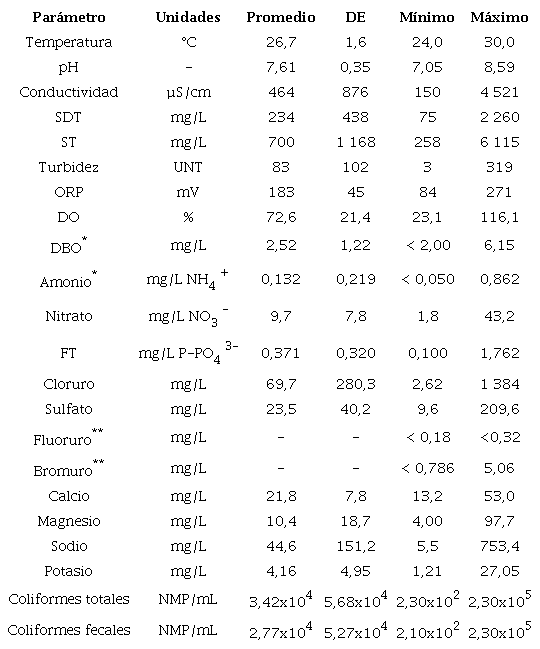 El sulfato, cloruro, sodio, potasio, calcio y magnesio presentaron altas desviaciones estándar; únicamente el sulfato no presentó diferencia estadísticamente significativa (p>0,05) entre los sitios o las épocas. El bromuro y fluoruro, en más del 80% de las muestras, tuvieron concentraciones menores a los límites de cuantificación de la técnica analítica empleada (0,786mg/L y 0,32mg/L, respectivamente), destacando el sitio 4 con el valor máximo para el bromuro (Cuadro 1).