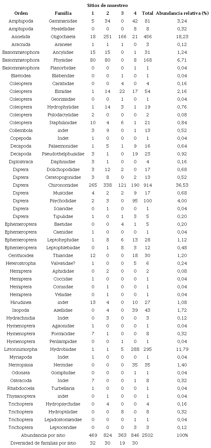 De éstos, los que presentaron mayor número de individuos fueron: Chironomidae con un 36,53% (914 individuos), Oligochaeta 18,23% (456 individuos), Hydrobiidae 11,79% (295 individuos), Physidae 6,71% (168 individuos) y Psychodidae 4% (100 individuos), las demás familias tuvieron una abundancia inferior a 85 individuos. Con respecto a los sitios de muestreo, la familia Chironomidae fue la más abundante en los sitios 1 y 2; Oligochaeta en el sitio 3 e Hydrobiidae en el sitio 4.