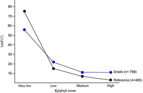 I found no difference between seasons on the snail´s epiphyll cover preference (Chi square: χ2= 6,91; Df=3; p=0,0748; n= 769). I found more snails on leaves with very low epiphyll cover (Fig. 1). However, when I compared snail´s epiphyll cover preference with the reference (epiphyll cover in the understory), I found that this species tended to be on leaves with more epiphylls visible to the naked eye, although those leaves were scarce (χ2= 50,59; Df=3; p<0,0001; n= 1 254) (Fig. 1). For example, although only 3% of the leaves in the understory had high epiphyll cover, 11% of the leaves in which I found T. costarricanus were almost completely covered by epiphylls.