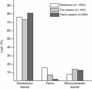 In the laboratory, I used a standardized grid with 345 evenly distributed dots digitally overlaid on each photograph to establish the reference percentage of monocotyledon, dicotyledon and fern leaves in the wild. For this purpose, I counted the number of dots falling over monocotyledon, dicotyledon and fern leaves in the sampling site photographs. I did not count dots above trunks, soil, dead leaves, sky, unidentifiable leaves, or twigs. I also classified each collected leaf in the corresponding epiphyll and trichome cover category.