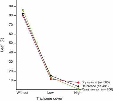 Trichome cover preference: In the reference understory, most leaves were glabrous (83%), followed by leaves with low trichome cover (14%). The less common leaves were those with high trichome cover (3%) (Fig. 3).