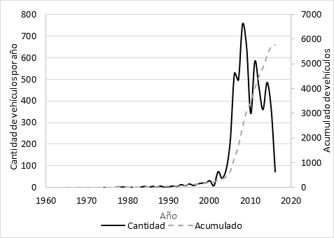 La muestra utilizada (5 766 unidades), corresponde en su mayoría a maquinaria agrícola alimentada con diésel como combustible. La mayoría tiene menos de 20 años de uso (Fig. 1), dándose un fuerte incremento desde 2005 al 2016 (92%), a pesar de que el mercado de vehículos agrícolas se incrementó desde 1998 con el aumento de área del cultivo de piña en el país. Hoy la cantidad de vehículos agrícolas se considera cercana a las necesidades de las áreas de cultivo, con los actuales procesos de compra tendientes a la renovación. Los vehículos agrícolas se compran preferiblemente por marca y pensando en largos periodos de uso, normalmente entre 10 y 20 años (Group World Bank, 2016).
