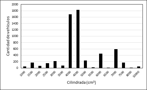 La maquinaria agrícola asociada a estos procesos fueron vehículos para la mecanización de la tierra y el trabajo de carga asociado, relacionadas con el desarrollo de áreas agrícolas pequeñas y medianas (Instituto Nacional de Estadísticas y Censos [INEC], 2014; Gómez-Calderón, N.; Solórzano-Quintana, M.; Villagra-Mendoza, K., 2017). En este sentido, la selección de vehículos con potencias medias permite una utilización continua de los mismos en distintos cultivos, facilitando su repago y mantenimiento. Dentro de estos, se determinó que los vehículos agrícolas son principalmente tractores diésel, con cilindradas entre 4000 - 5000 cm3 (61% de la totalidad del parque), asociados a la categoría II (según ASAE S482). Secundariamente, existe otra cantidad importante de vehículos con cilindrada entre los 6000 y 7000cm3 (18% del parque), coincidiendo con los tractores de categoría III (según ASAE S482). Estos últimos vehículos son utilizados en labranza de suelos en áreas extensas de topografía menos irregular (Gómez-Calderón, N.; Villagra-Mendoza, K.; Solórz, M., 2018; Gómez-Calderón, 2016).