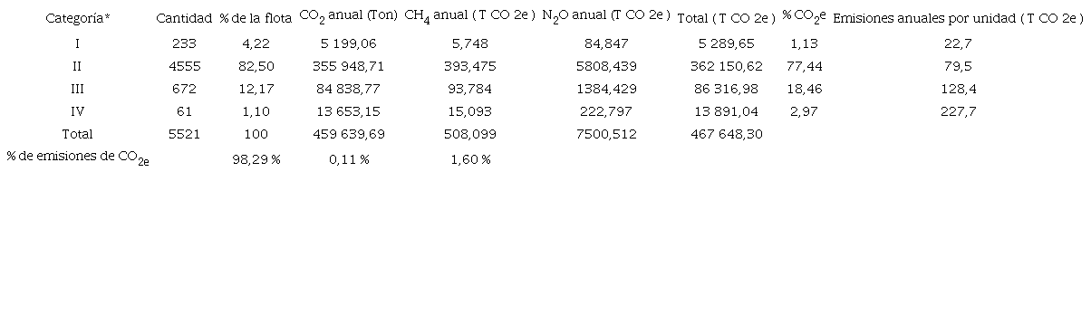 La mayor cantidad de vehículos agrícolas utilizados en el país son tractores de categoría II con cilindradas entre 4 000 y 4 500cm3 (61%), comúnmente usados para transportar productos, plantar, cosechar y dar mantenimiento de los principales cultivos del país. La estimación de los GEI expresada en T_(〖CO〗_2e ) (Tabla 3) plantea un valor global en el 2016 es de 467 648,30 T_(〖CO〗_2e ), asociado principalmente a emisiones de CO2 (98%), para el 95,8% de la muestra de maquinaria de este estudio. Como es de esperar, las tasas de emisiones de T_(〖CO〗_2e ) por vehículo se incrementen con la categoría ASAE S482 del mismo (Tabla 3). Mientras que la mayor proporción de emisiones está relacionada con las categorías de mayor cantidad de vehículos (categoría II y III), representando estas más del 95% de las emisiones, con cerca del 95% de los vehículos. La categoría II es la más importante, con el 82,5% de la flota y el 77,4% de las emisiones.