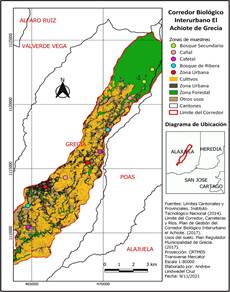 El Corredor Biológico Interurbano el Achiote, se ubica en la provincia de Alajuela, y comprende algunos distritos del cantón de Grecia como Puente de Piedra, San José, San Roque, San Isidro, Tacares y Grecia. Además, incluye una pequeña parte del distrito de San Juan, perteneciente al cantón de Poás. El corredor biológico cuenta con una superficie de 55,23km2, en donde se seleccionaron diez puntos de muestreo, dos por cada tipo de cobertura de uso del suelo, los cuales fueron: cultivo de café, cultivo de caña de azúcar, zonas urbanas, bosque secundario y bosque de ribera.