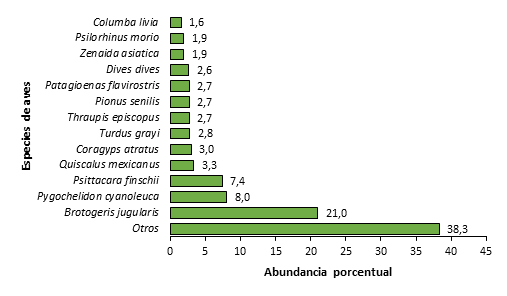 Para el corredor biológico registramos un total de 194 especies de aves silvestres, agrupadas en 42 familias y 17 órdenes (Tabla 1 en Apéndice). El orden Passeriformes fue el más abundante con 123 especies. Las familias más representativas en cuanto a riqueza fueron Tyrannidae con 21 especies, seguida de Parulidae con 18 especies, Trochilidae con 14 especies y Thraupidae con 13 especies. En cuanto a la abundancia relativa calculada, el perico barbinaranja (Brotogeris jugularis), fue la especie más abundante con el 20,9% de los registros, seguida de la golondrina azul y blanco (Pygochelidon cyanoleuca) representando un 8,04%, y el loro frentirrojo (Psittacara finschii) con 7,41% (Fig. 2).