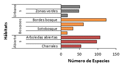 La distribución de las especies de aves con respecto al tipo de hábitat presentó diferencias significativas (x2= 198,91, gl= 9, pval< 0,05). La mayoría de las especies se agruparon en hábitats abiertos (Fig. 3). Por otro lado, en los hábitats con mayor cobertura boscosa, las aves teóricamente presentan preferencia hacia las zonas de borde. Por su parte, en las zonas más urbanizadas las aves prefieren más los hábitats asociados a las áreas verdes y en los márgenes de ríos y quebradas.