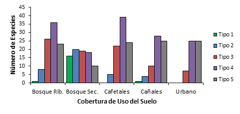 Las categorías de dependencia al bosque más abundantes entre las especies de aves son las menos dependientes (tipos cuatro y cinco), en contraposición con las aves más dependientes (tipos uno y dos) (F=9,15, gl=4, p< 0,05) (Fig. 4). Sin embargo, en las categorías altamente dependientes, las especies se concentran en los bosques secundarios, los cuales presentaron un total de 36 especies (tipo uno y dos), mientras que, en el uso del suelo urbano estuvieron ausentes, y solamente 5 especies fueron registradas para los cañales y los cafetales. Algunas de las especies poco comunes, y altamente dependientes del bosque para el corredor, son: pava negra (Chamaepetes unicolor), paloma perdiz (Zentrygon costaricensis), colibrí montañés gorgimorado (Lampornis calolaemus), lechuza serranera (Megascops clarkii), codorniz moteada (Odontophorus guttatus), saltón cabecicastaño (Arremon brunneinucha) y el quetzal (Pharomachrus mocinno).