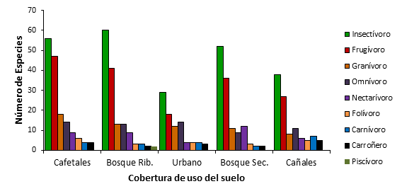 La composición de los gremios muestra una tendencia similar entre los tipos de cobertura de uso del suelo (KW=0,72, gl=4, p> 0,05), aunque entre los tipos de gremios si se encontraron diferencias significativas (F=33,73, gl=8, p< 0,05) (Fig. 5). Los gremios predominantes fueron los insectívoros (Tyrannidae, Parulidae, Vireonidae, Picidae, Dendrocolaptidae, Troglodytidae) y frugívoros (Turdidae, Cracidae, Trogonidae, Pstittacidae, Thraupidae e Icteridae), en contraste con grupos más reducidos como carroñeros (Cathartidae), nectarívoros (Trochilidae), omnívoros (Ramphastidae, Fringillidae, Thraupidae, Icteridae, Momotidae), granívoros (Columbidae, Passerellidae, y Cardinalidae) y carnívoros (Falconidae, Accipitridae y Strigidae), los cuales registraron menos especies. Para el gremio trófico piscívoro, únicamente se registraron dos especies dentro del bosque de ribera, las cuales fueron el martín pescador verde (Chloroceryle americana), y el martín pescador collarejo (Megaceryle torquata), mientras que los folívoros fueron representados por los sinsontes (Saltator coerulescens y Saltator maximus), así como la codorniz crestada (Colinus cristatus), junto con otras 6 especies (Psittacidae y Columbidae).