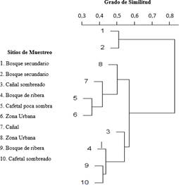 los ensambles de aves varían de acuerdo con los tipos de cobertura de uso del suelo dentro del corredor biológico (F=3,24, gl=4, r2=0,72, p< 0,05). Mediante el análisis del Cluster, con una correlación cofenética del 0,906, señala que los sitios con más similitud en cuanto a la comunidad de especies de aves que albergan, se clasifican en 3 grupos (Fig. 6): Grupo A con los sitios uno y dos (bosque secundario), el grupo B con los sitios más alterados que fueron el sitio cinco (cafetal con poca sombra), sitio siete (cañal sin sombra), y los sitios seis y ocho (urbanos), y finalmente el grupo C con los sitios más arbolados, que fueron los sitios cuatro y nueve (bosque de ribera), junto con el sitio diez (cafetal sombreado) y el sitio tres (cañales y potreros sombreados).