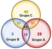 El grupo A contiene 94 especies de aves, de las cuales 18 comparte con el grupo B y 37 con el grupo C. Por su parte, el grupo B cuenta con 88 especies de aves, de las cuales comparte 57 con el grupo C, dejando únicamente 3 especies exclusivas de los sitios más alterados del corredor. Finalmente, el grupo C cuenta con la mayor cantidad de especies, con un total de 144, de las cuales 40 son exclusivas y no se comparten (Fig. 7). Únicamente 10 especies se traslapan entre todos los grupos.