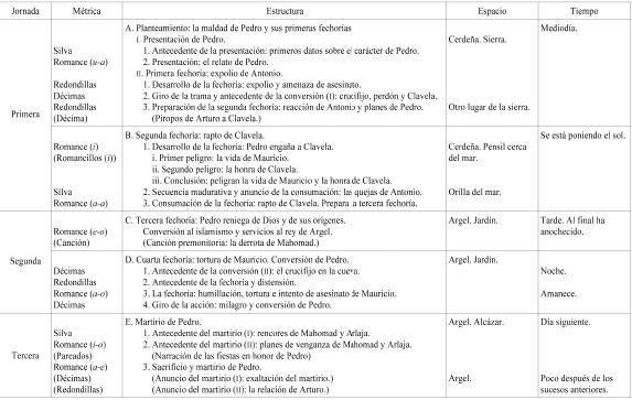 No obstante, la segmentación de esta jornada no es tan sencilla como parece. Situémonos en la microsecuencia 3: Pedro anuncia su intención de entregar la ciu- dad, que, oída al paño por los moros, causa que estos se rebelen y prendan al rey y a Arturo, que logra escapar (los demás personajes ya han abandonado la escena). En este momento queda vacío el tablado y sale Mauricio, que, en cinco décimas, pronuncia una exaltación del martirio. Sale Arturo huyendo del bullicio, que narra en doce redondillas la saña con que están linchando a Pedro. Nótese que su llegada corriendo sería un indicio de un cambio de lugar respecto al segmento anterior en romance, al final del cual el gracioso escapaba, y, así, implicaría también un lapso temporal indeterminado. Terminado su relato, se vuelve al romance en a-e, y, en cincuenta y ocho versos asistimos a la muerte del rey y desenlace de la obra. En este momento hacen acto de presencia Mahomad y Arlaja como nuevos reyes des- de arriba: ¿entendemos que están en un balcón?, ¿en las murallas? Sea como sea, esto parece indicarnos también que ha habido una mutación espacial respecto al pasaje en romance anterior.