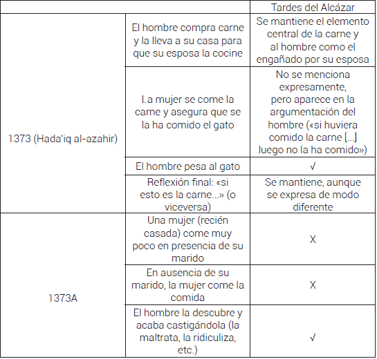 La singularidad del relato, a la que se hace alusión en el título del presente trabajo, reside en su esquema argumental, que impide relacionarlo con un solo cuento tipo (o variantes del cuento tipo 1373) de los mencionados con anterioridad. Así las cosas, si se analiza su composición se comprueba que se trata de una versión híbrida, que comparte elementos con el relato árabe inserto en los Hada’iq al-azahir (1373), pero también con las versiones catalogadas bajo la numeración 1373A, en la que la mujer es finalmente maltratada por su marido tras descubrir este último el ardid urdido por su esposa para engañarle. En la siguiente tabla comparativa, se muestran los motivos y elementos que el relato de las Tardes del Alcázar mantiene y toma de cada una de las versiones señaladas: