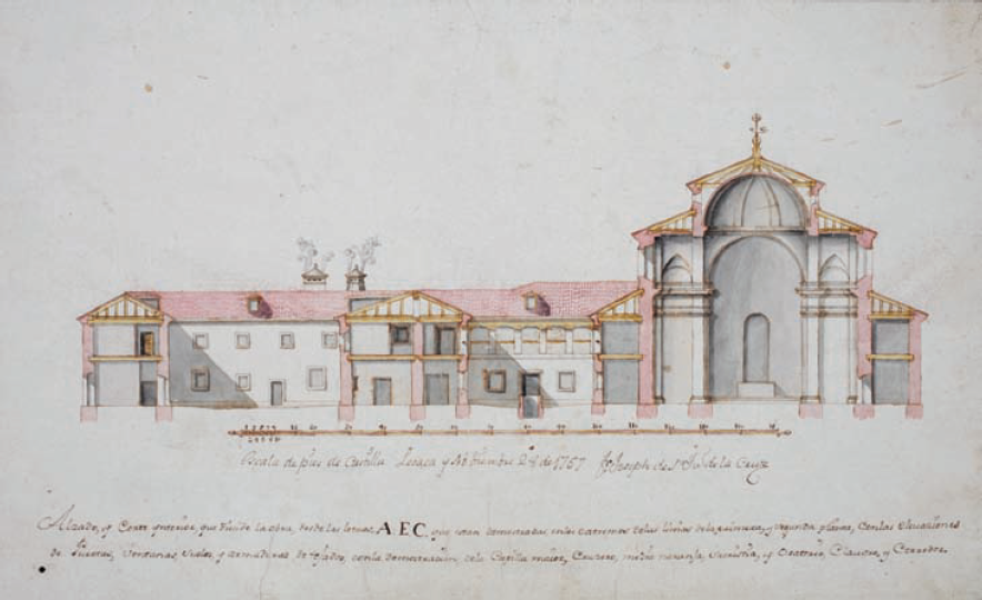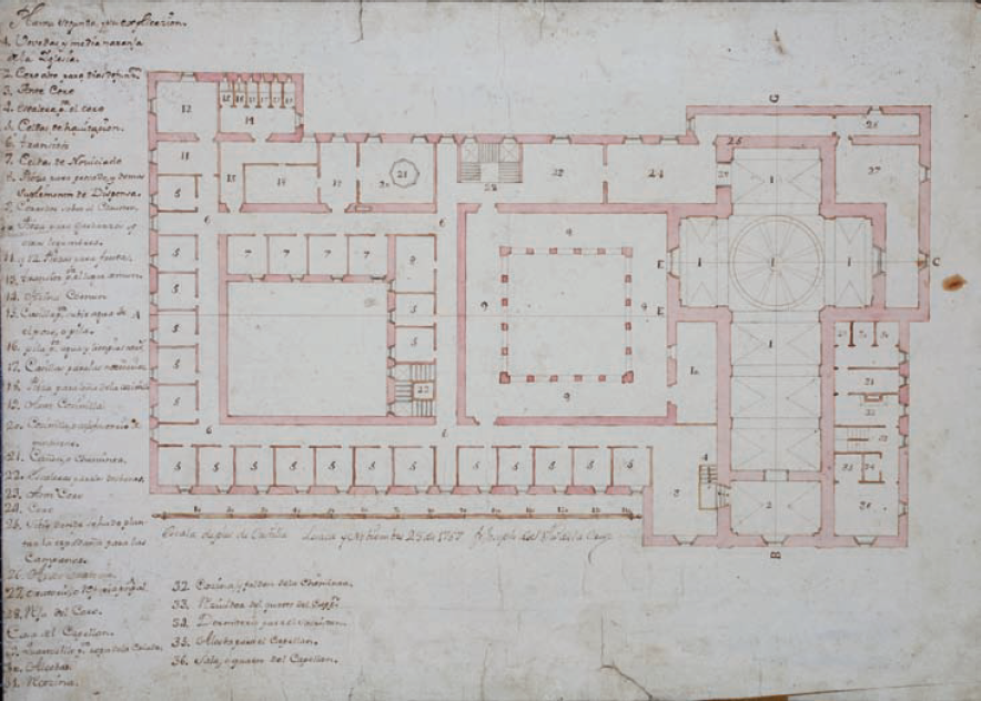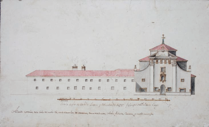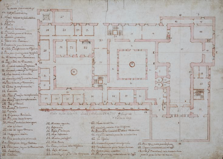 Un claro ejemplo de cómo se organizan los distintos espacios que conforman el complejo conventual carmelitano descalzo se puede apreciar a través de los dibujos arquitectónicos del siglo XVIII trazados para la ejecución del convento de religiosas de Lesaca (Navarra), erigido bajo la advocación de Nuestra Señora de los Dolores, gracias a la generosidad de su fundador, el indiano Ignacio de Arriola38. Plantas y alzados que fueron realizados en 1767 por fray José de San Juan de la Cruz (1714-1794), un religioso excepcional en el campo de las artes que aunaba las especialidades de tracista, ingeniero, arquitecto y dorador39.