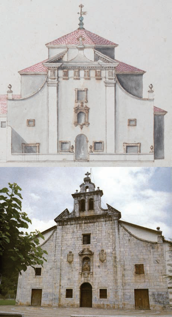 Otro de los dibujos de san Juan de la Cruz es un alzado del exterior del convento (Imagen 9), con la fachada longitudinal que da a los pies de la iglesia, recorrida por dos líneas de ventanas que se corresponden a los dos pisos de altura del complejo, vanos de distinto tamaño y distribuidos sin ritmo espacial alguno. Edificio al que se une la sobria y pétrea portada de la iglesia precedida del atrio, que siguiendo el esquema habitual en la Orden se compone de un paramento central rectangular de disposición vertical enmarcado por dos pilastras lisas sobre las que corre un friso de triglifos y metopas, rematado por frontón triangular partido en el que se inscribe una cruz, quedando este espacio flanqueado por dos alas laterales de menor altura, con puertas y ventanas, que se unen mediante aletones curvos. En el plano central se aprecia la triple división en altura, con una puerta de medio punto de ingreso delimitada por dos ventanas cuadradas, encima una hornacina entre pilastras coronada por frontón partido, y sobre ella una ventana rectangular moldurada con orejetas. Un diseño de fachada que fue respectada en su ejecución, introduciendo leves cambios, como la colocación de los escudos de los patronos a ambos lados de la hornacina, en el interior de la que se dispuso la titular del convento, Nuestra Señora de los Dolores con el Niño, así como la eliminación del friso de triglifos, sustituido por uno liso, y la parte central del frontón que remata en una esbelta espadaña en vez de con la cruz señalada en el dibujo (Imagen 10). El esquema general evidencia un conocimiento por parte del tracista carmelita de los modelos para fachadas y frontispicios propuestos por fray Lorenzo de San Nicolás en su Arte y Uso de la Arquitectura44, ya que la fachada del convento de Lesaca se asemeja bastante a uno de ellos, aunque reduciendo los elementos ornamentales.