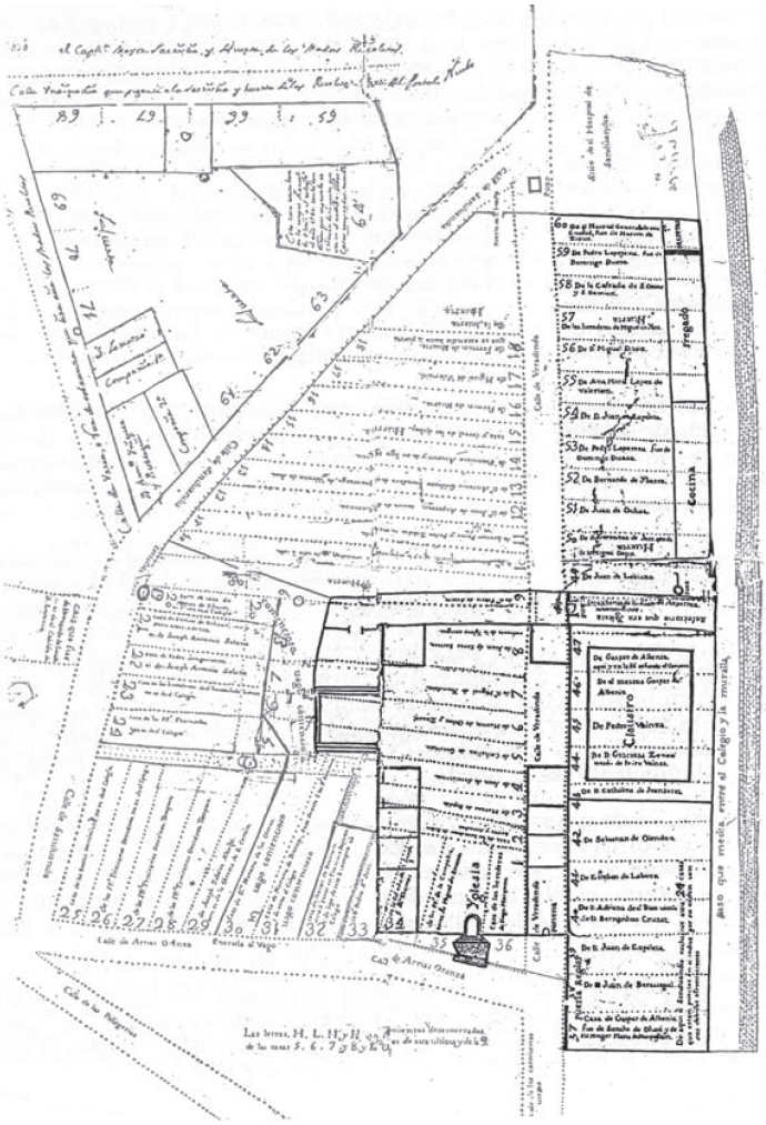 Las dimensiones del edificio conventual exigieron a los frailes adquirir entre 1640 y 1660 la elevada cifra de 71 casas situadas entre la muralla que mira a la Rochapea y las calles Urradinda, Arrias Oranza y Santo Andía, por las que pagaron un alto precio, más de 10.000 ducados, debido a la especulación de los propietarios, inmuebles que fueron comprados poco a poco, según se construía el convento y se recaudaba dinero35. Las obras se iniciaron, tras el establecimiento de los carmelitas en el emplazamiento definitivo, en octubre de 1640, y los primeros trabajos de derribo y acondicionamiento del suelo por el claustro y sus dependencias, en los que trabajaron los maestros Juan de Urquía y José de Lagurrea.