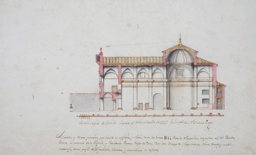 José de San Juan de la Cruz también trazó el alzado y corte interior de la iglesia (Imagen 8), en la línea de los dibujos recogidos por fray Lorenzo de San Nicolás en su tratado Arte y Uso de Arquitectura, utilizando diferentes tintas de colores como en el caso anterior, cuyo espacio arquitectónico se ajusta a las características propias de una iglesia conventual de carmelitas descalzas. Un templo precedido por un atrio, al que sucede el nártex sotocoro que sirve de ingreso al interior, sobre el que se coloca en alzado el coro alto, que enlaza con la única nave dividida en tres tramos, crucero y cabecera recta. Articulan los muros perimetrales pilastras de capitel dórico que soportan un entablamento, por encima del cual se elevan las bóvedas de lunetos y media naranja que voltea el tramo central del crucero, cubriéndose todo ello con una armadura de madera. También se dibuja en el muro de la nave el hueco para albergar el retablo y los nichos destinados a confesionarios, y en el espacio de la cabecera los vanos de comunicación con el coro y la pequeña ventana para comulgar.