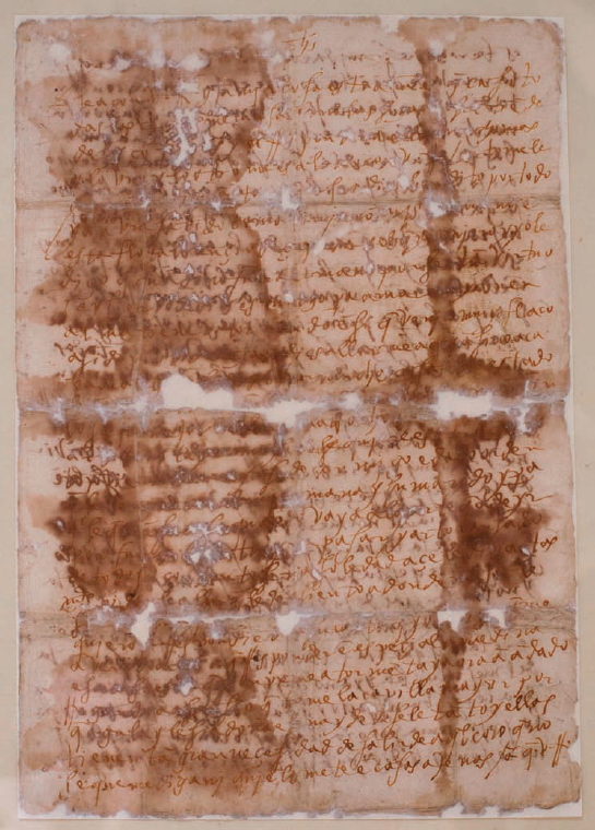 El autógrafo de Teresa de Jesús está escrito sobre cuatro hojas de papel simple de 212 x 303 mm. La presentación del material muestra gran deterioro por la humedad, a pesar de la restauración realizada en 1943. Muestra cinco dobleces: cuatro horizontales y uno vertical. La tinta es de color marrón que se trasluce en el papel. La primera hoja tiene 29 líneas; la segunda, 27; la tercera, 28; y de la cuarta solamente se tiene dos fragmentos: uno de ellos firmado por la santa.