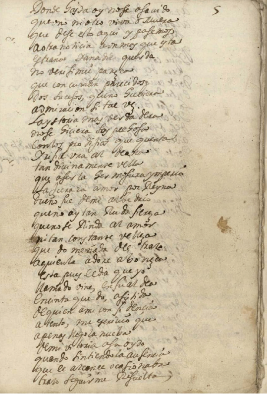Pese a la poca limpieza del folio en los versos de la imagen anterior, testimonio del tiempo que Calderón dedicó a revisarlos y de la dificultad de encontrar la forma final satisfactoria, las marcas residuales de la reescritura son fácilmente perceptibles. Aunque cabría esperar una mayor distorsión en la sintaxis cuanta más reelaboración —pues el frecuente reaprovechamiento parcial del verso y la suciedad del folio dificultan la claridad—, la construcción puede quedar truncada en fragmentos más pulcros. Esta situación se da en el folio 32r, versos 536-540 de la segunda jornada, de En la vida: