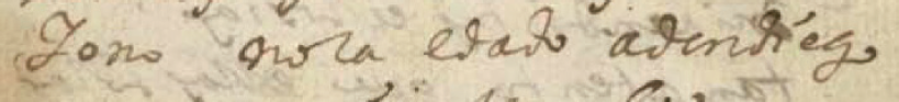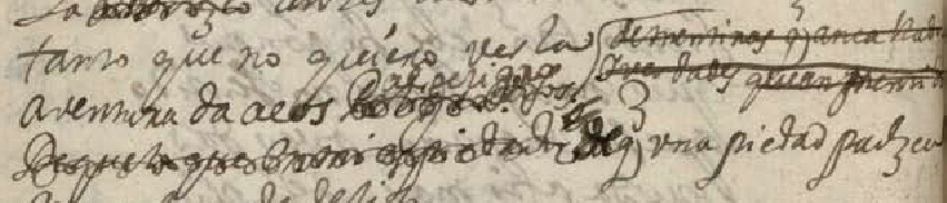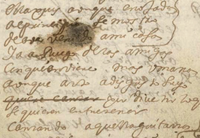Dichos procesos de reescritura de fragmentos pueden dejar un elevado número de tachaduras. Pese a la falta de claridad en el folio, la lectura quedaría adecuada al pasaje con la supresión de una palabra, detectable por el cómputo y por el sentido. La siguiente imagen del folio 53v de En la vida ofrece un ejemplo: la profunda revisión y reescritura del verso 592 termina su redacción final en «aventurada a los al peligro». Sin duda, la preposición y el artículo marcados en cursiva sobran para la adecuada sintaxis del octosílabo: