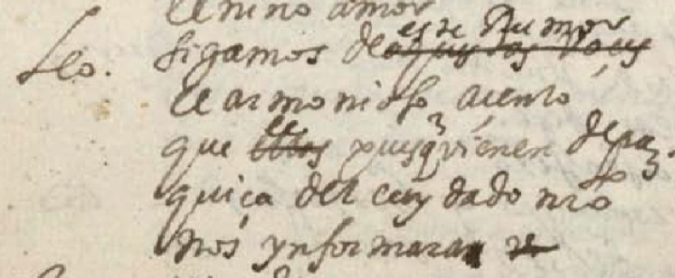 El fragmento seleccionado es elocuente para un acercamiento a los errores y olvidos sintácticos tras un proceso de reescritura. Como se distingue en la imagen, el cambio de las voces por este rumor desencadena el resto de las modificaciones. Dado el cambio de género y de número, el pronombre ellas del verso 538 debe ser sustituido por el él situado en el espacio interlineal superior. Ante la rectificación, solo uno de los dos verbos dependientes del sujeto es modificado: el verbo informarán, reformulado en informará, queda en concordancia con su sujeto; mientras que vienen ubicado inmediatamente después de su sujeto, queda en su forma plural primigenia27. Ante la falta de concordancia entre el verbo vienen y el sujeto él, el resto de testimonios enmiendan el error con la lectura viene.