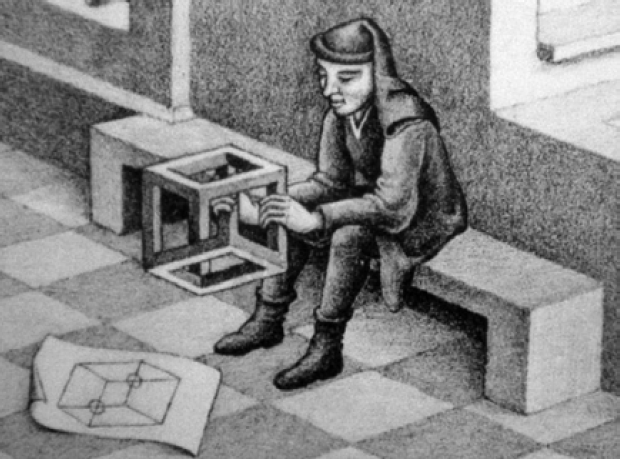 Atormentado por el cubo imposible en el que se confunden interno y externo burlándose de la vista aprovechando las ilusiones ópticas innatas en la percepción humana, el hombrecito (imagen 1) lo observa con obstinada resignación, como si comprobar la posibilidad de lo imposible hiciera vacilar su misma certeza de existir. Este es el mecanismo que se instaura a través del personaje del observador: la posibilidad que se le concede de asistir a la trasformación de lo imposible en posible es su maldición, el obscuro sendero hacia su inexistencia. Admitir tener en sus propias manos un objeto que en el espacio tridimensional es irrealizable, quiere decir descubrir encontrarse a un paso del abismo. La tridimensionalidad de un objeto imposible se puede representar solo bidimensionalmente, o sea en la ficción de un dibujo. El observador que tenga en las manos el cubo de Necker, tras el asombro inicial y la ilusión de una inesperada descifración, tendrá que ceder a la desilusión, ya que estará obligado a reconocer ser él mismo una ficción.