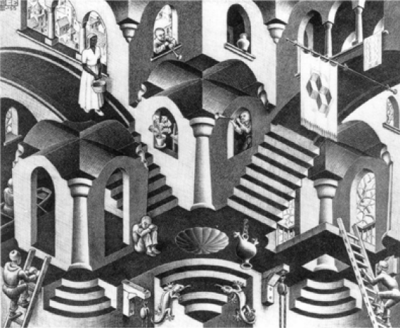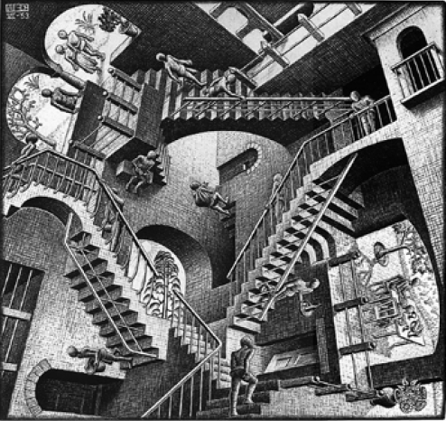 En la litografía Relativity de Escher (imagen 6) las personas que pueblan un mundo ignoran completamente los mundos diferentes que las rodean; e incluso cuando dos personajes utilizan la misma rampa de escaleras para bajar y subir parece que nunca entren en contacto. Los tres mundos presentados coexisten en realidades espacio-temporales diferentes, cada una con su propria luz que llega de los jardines externos. Las figuras humanas presentes se pueden dividir en tres grupos y se las representa de manera que no estén caracterizadas y no sean bien distinguibles las unas de las otras: así se aumenta la sensación de desconcierto que el artista persigue.