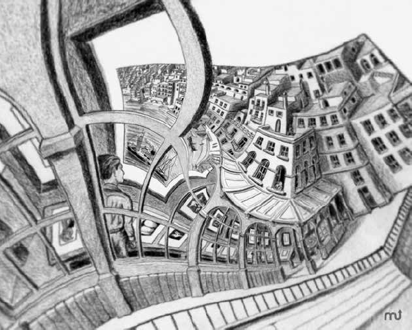 También las obras gráficas de Maurits Cornelis Escher (1898-1972) están orientadas a comunicar un proceso de pensamiento parecido, que el mismo artista describe como sigue: «Mis ideas están basadas en mi asombro y admiración por las leyes contenidas en el mundo que nos rodea. Quien se maravilla de algo, toma conciencia de algo maravilloso. En el momento que estoy abierto y sensible frente a los enigmas que me rodean, analizando mis observaciones, entro en contacto con la matemática»22.