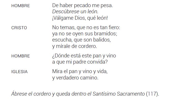 Hay algún ejemplo más: en El nombre de Jesús se enumeran los nombres de Cristo entre los que aparecen los inevitables de león y cordero12, o el Auto famoso del nacimiento en el que Jesús niño es el invencible león de Judá que llora de hambre como tierno cordero haciendo pucheros a su madre13. En El tirano castigado, el Género Humano advierte al demonio que vendrá en su ayuda el león Cristo disfrazado de cordero14.